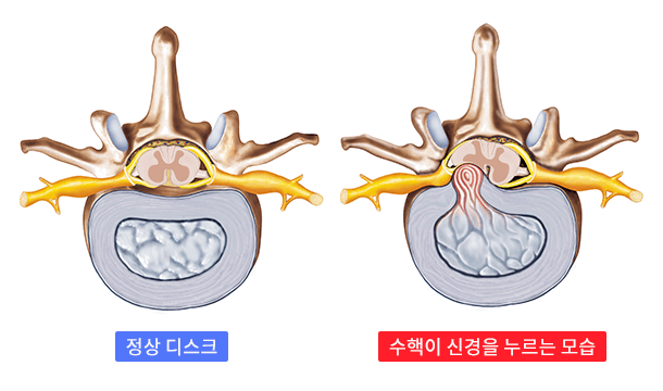척추 사이에는 수핵과 수핵을 감싸고 있는 디스크가 있습니다. 이는 외부로부터 충격을 흡수해주는 역할을 하는데 어떠한 원인으로 인해 파열될 경우 밖으로 빠져나온 수핵이 척추가 지나가는 신경을 압박하여 통증을 유발하는 질환을 허리디스크라고 합니다.